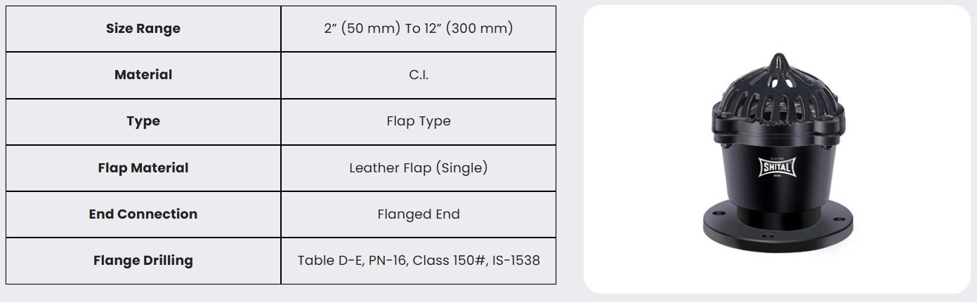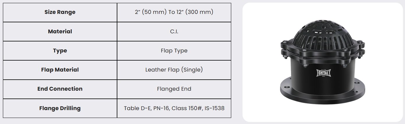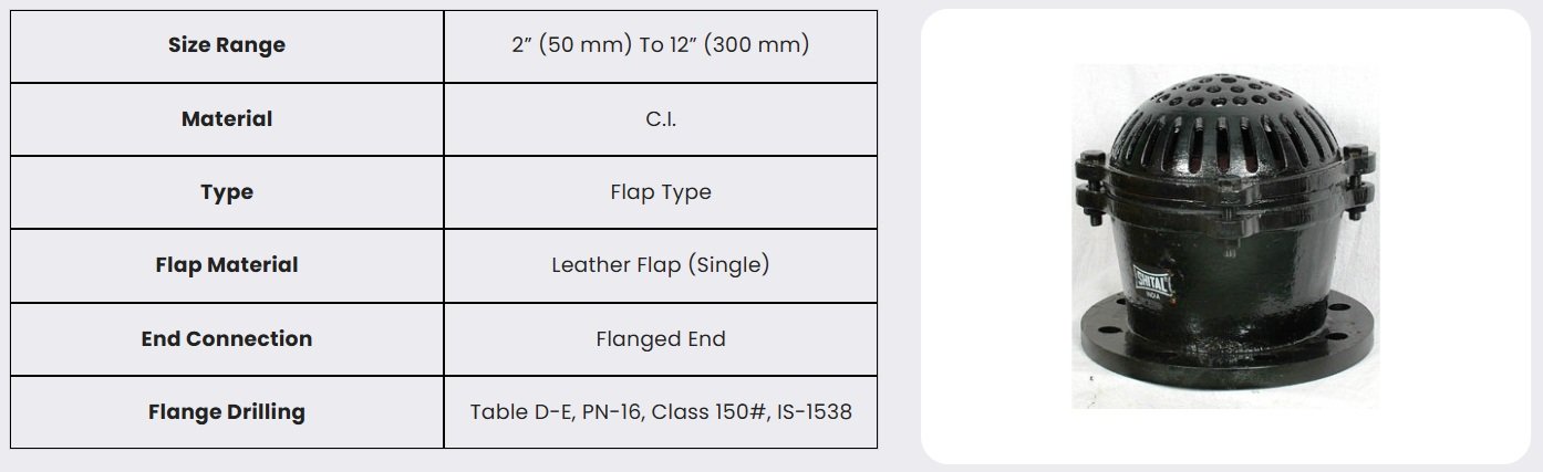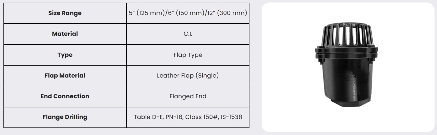 The valve is built with a robust and durable construction that ensures minimal head loss across the valve. It incorporates perfectly flat seating surfaces to provide effective sealing and prevents foreign particles from entering the pump through the suction pipe.