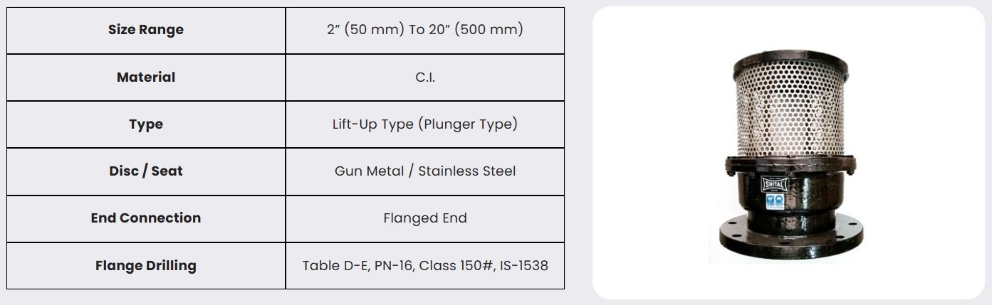 The valve features a robust and durable construction that ensures minimal head loss during operation. It incorporates precisely flat seating surfaces for reliable sealing and effectively prevents foreign particles from entering the pump through the suction pipe.